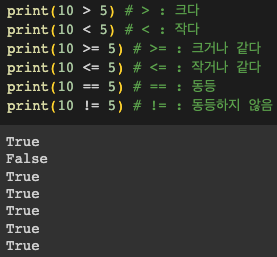 비교 연산자는 주로 두 값을 비교하는 데 사용되며, 그 결과는 항상 불리언(True 또는 False) 값입니다.