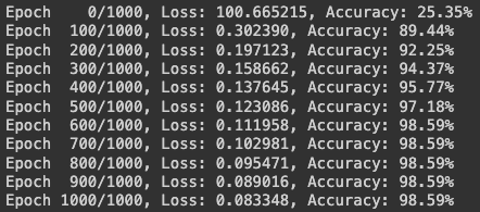 print(f'Epoch {epoch:4d}/{epochs}, Loss: {loss:.6f}, Accuracy: {accuracy:.2f}%')