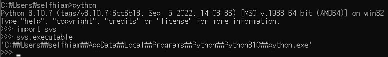 ※ 만약 자신이 설치한 경로를 모를시 cmd(명령 프롬프트) -> python -> import sys -> sys.executable을 입력하면 설치된 경로를 알려줍니다.