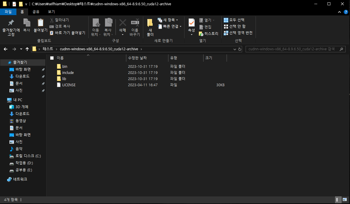 해당 bin, include, lib 파일이 나오는데 해당 3개의 폴더를 이전(3번, CUDA)에 설치한 경로에 넣어주면 됩니다.
