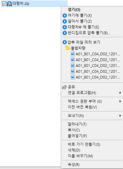 새롭게 생긴 "대형차.zip"을 우클릭을 눌러서 자신이 원하는 방식으로 압축을 푸시면 이상없이 사용이 가능합니다.