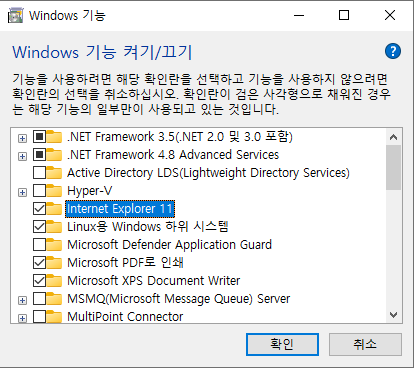 4. [Linux용 Windows 하위 시스템]을 체크 후 확인을 누릅니다.
