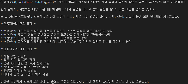 아래의 예시에서는 "인공지능이란 무엇인가요?"라는 질문에 대한 답변을 생성합니다.
