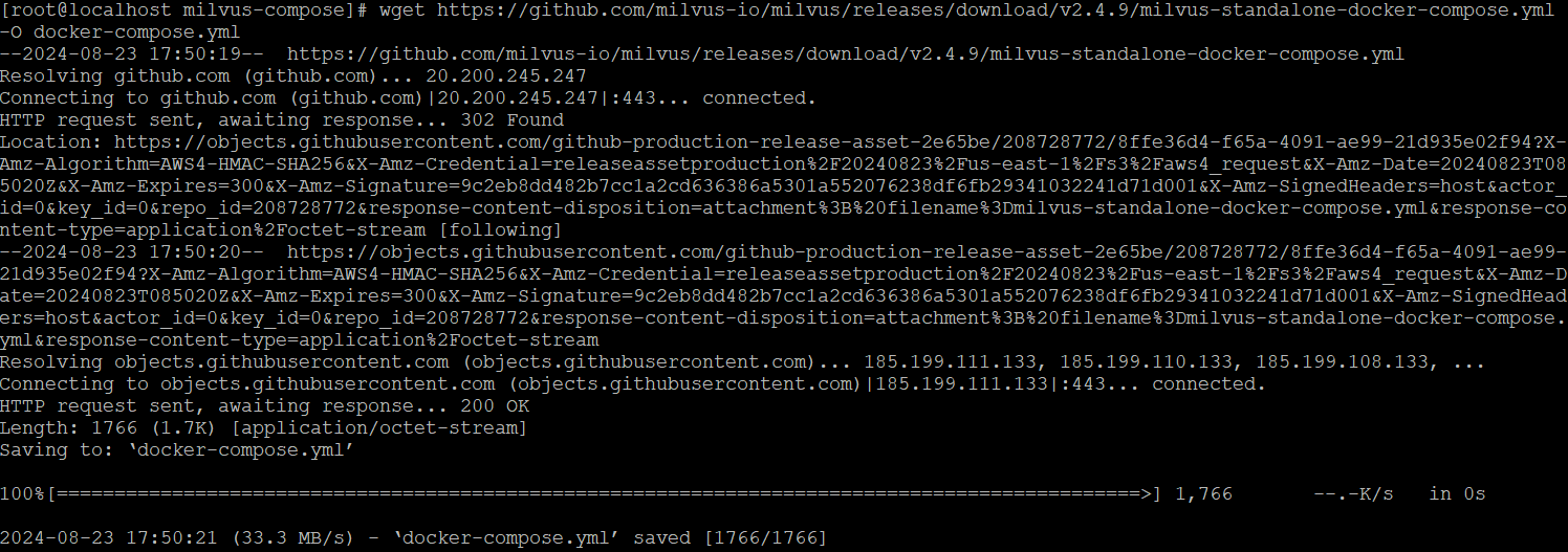 wget https://github.com/milvus-io/milvus/releases/download/v2.4.9/milvus-standalone-docker-compose.yml -O docker-compose.yml
