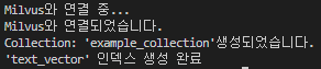 생성된 컬렉션의 이름과 함께 성공 메시지를 출력합니다. - 벡터 필드 인덱스 생성: 생성된 컬렉션의 벡터 필드(text_vector)에 대해 인덱스를 생성합니다.