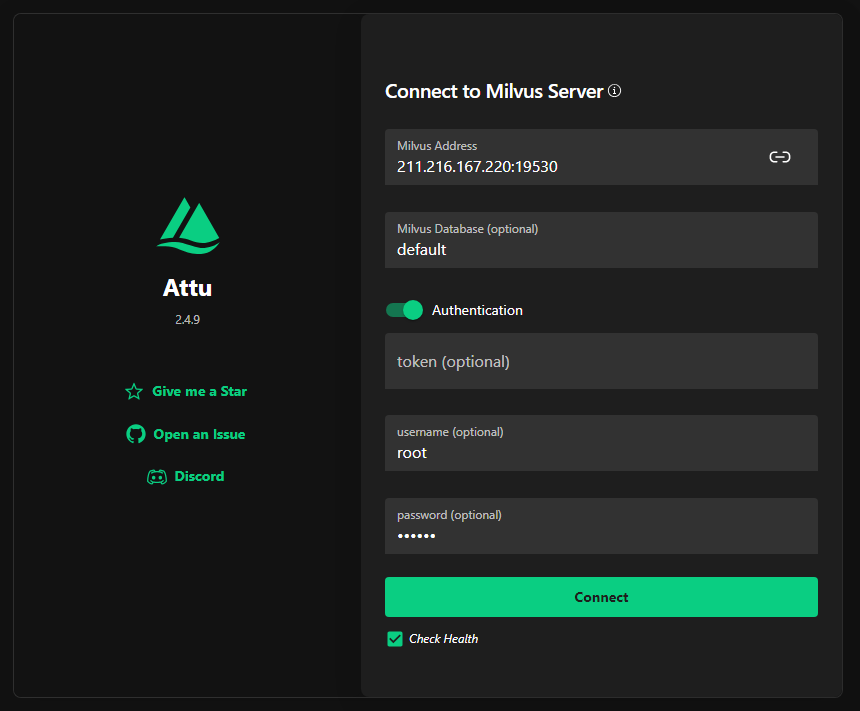 이제 milvus보안 적용이 되었으니 attu도 해당 인증키를 가지고 적용을 해야합니다.