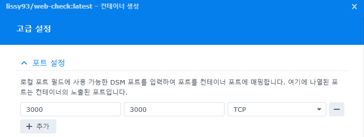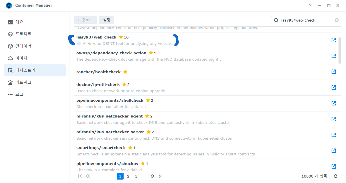 [Container Manager]를 실행 -> [레지스트리] 클릭 -> "lissy93/web-check" 검색