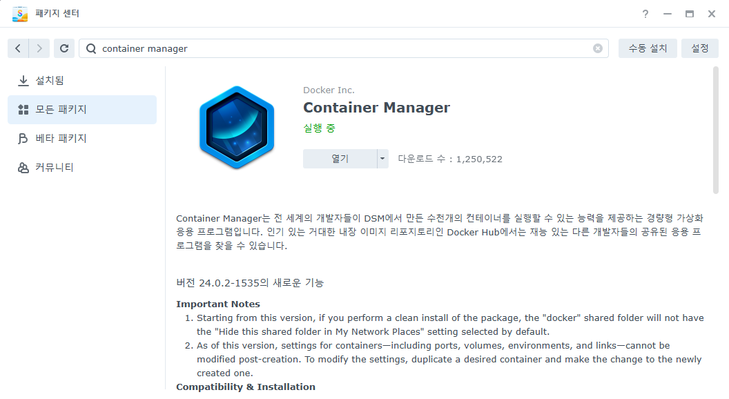 [패키지 설치] 클릭 및 "Container Manager" 설치