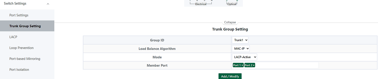 "Switch Settings" -> "Trunk Group Setting"에서 LACP-Active를 설정합니다.