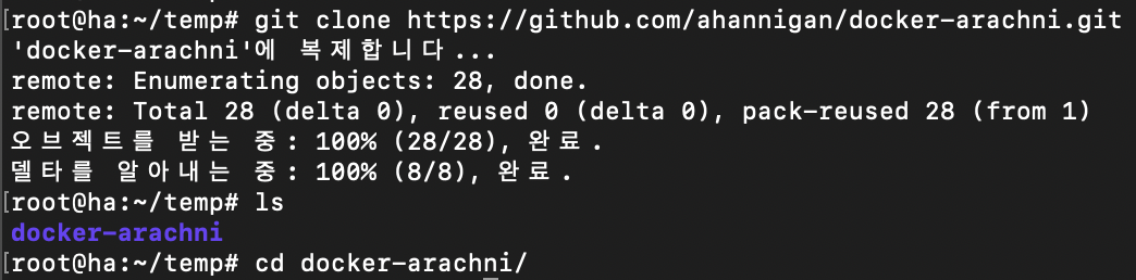 ㄴ 해당 방법을 사용하기 위해서는 /temp/docker-arachni라는 폴더의 docker-compose.yml 파일이 있어야하며, 해당 경로에 있어야합니다.