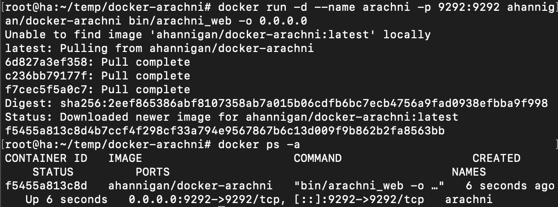 docker run -d --name arachni -p 9292:9292 ahannigan/docker-arachni bin/arachni_web -o 0.0.0.0