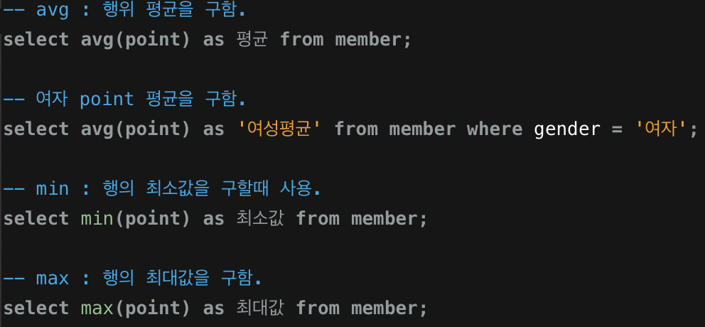 select 그룹을 맺을 컬럼 또는 집계함수 from 테이블명 group by 그룹을 맺을 필드명;