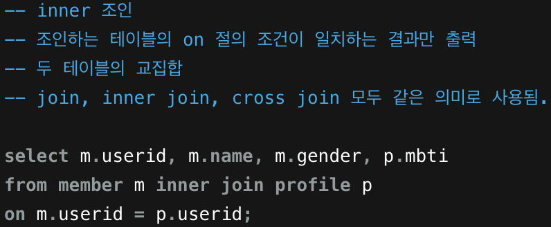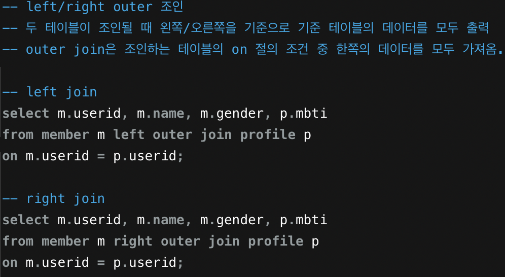 select 필드명1, 필드명2, ... from 테이블1 [inner, left, right] join 테이블2 on 테이블1.연결할필드 = 테이블2.연결할필드