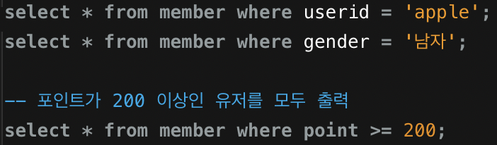 select 필드명1, 필드명2, ... from 테이블명 where 조건절;