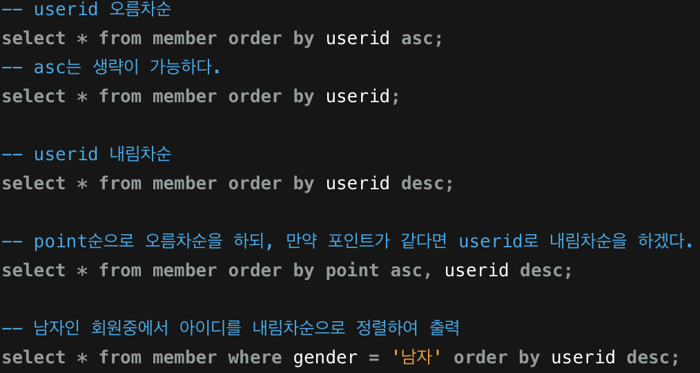 select 필드명1, 필드명2, ... from 테이블명 [where 조건절] order by 정렬할 필드명 [asc, desc];
