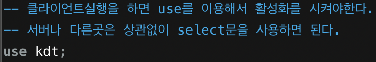 전날 클라이언트 실행을 하였고 2일차에서 프로그램을 재기동 해당 테이블을 사용을 할려고 하면 use명령어를 사용하여 활성화를 해야한다.