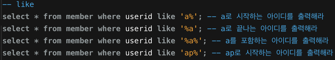 like : 패턴으로 문자열을 검색하여 값이 존재하면 true, 아니면 false